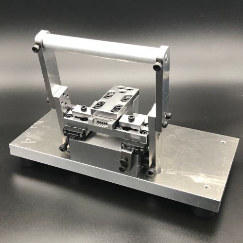 これは超簡単な線材を曲げる治具です。芯金のサイズ変更はミスミさんのプレス標準部品を使うので変更もカンタン。細いところで0.5mm程度の芯金を付ける場合もあります。